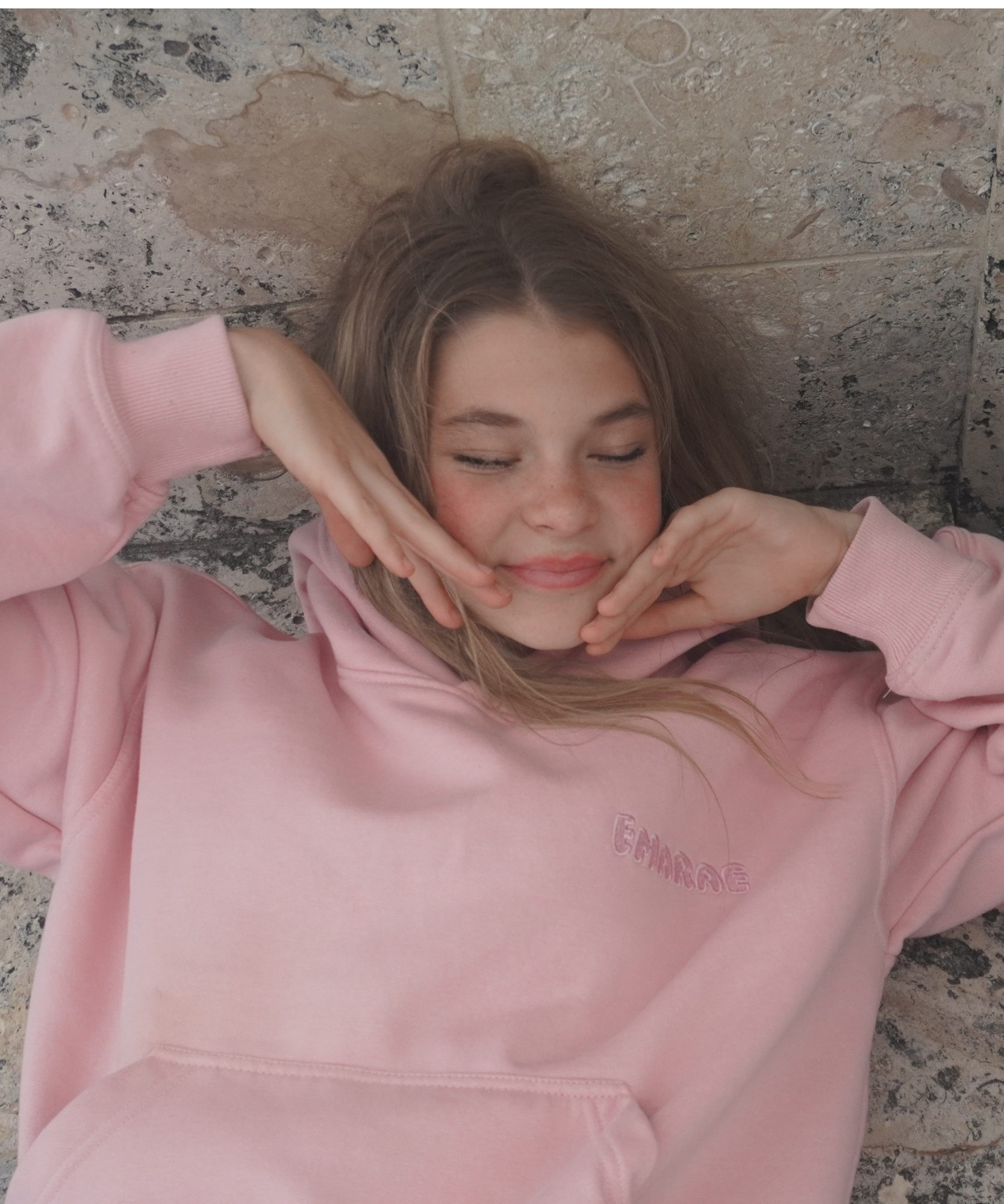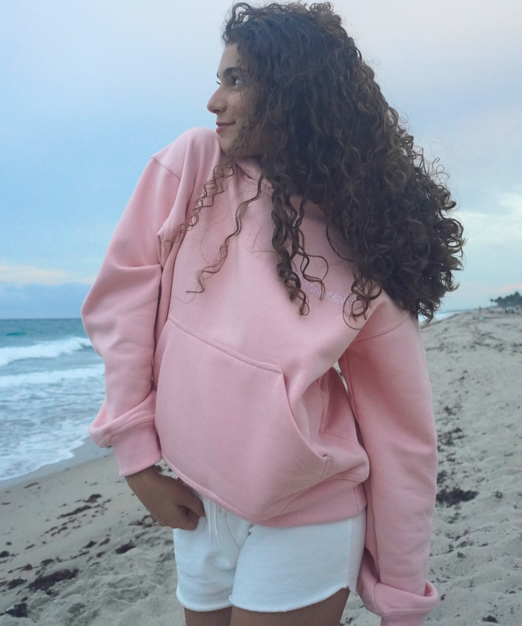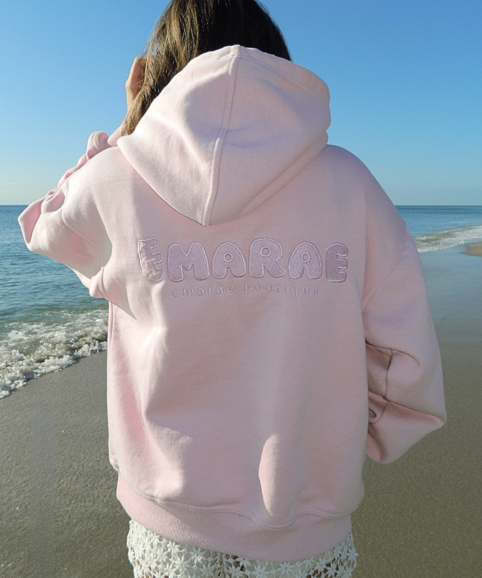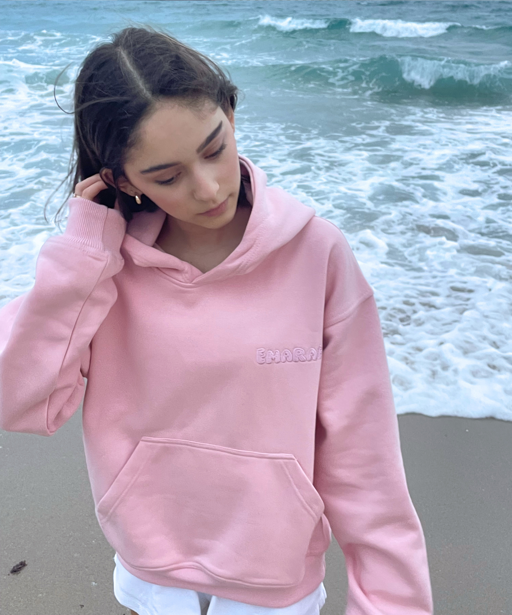 The Emarae Hoodie features a slightly cropped hem and relaxed shape, without being too baggy, so we recommend sizing up once for a roomier fit, and twice for oversized.